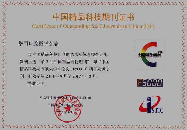经中国精品科技期刊遴选指标体系综合评价,《华西口腔医学杂志》入选第3届中国精品科技期刊,即“中国精品科技期刊顶尖学术论文(F5000)”项目来源期刊。有效期从2014年9月至2017年12月。这是《华西口腔医学杂志》连续第3次入选。