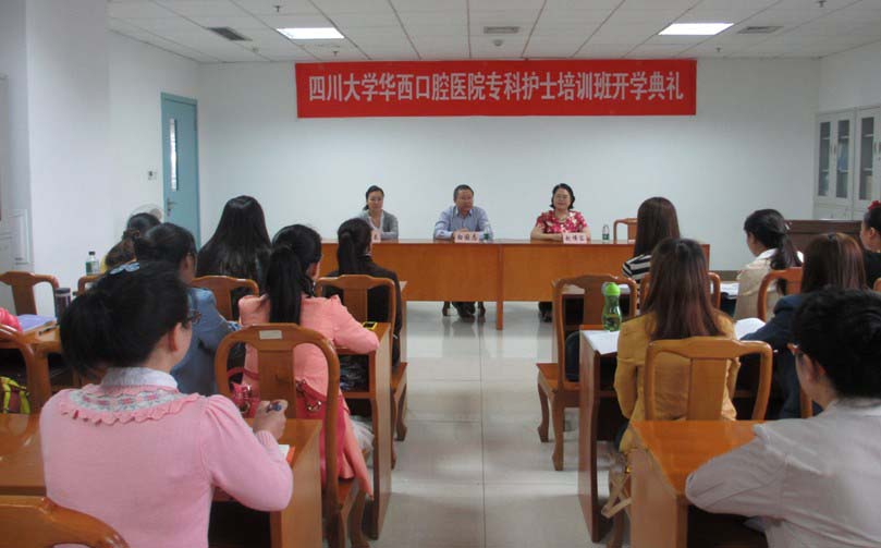 2013年9月6日,省继教项目第三届口腔专科护士培训班开班仪式在我院临床楼举行,本届培训学员来自全国各地,共计34人。开班仪式由护理部主任赵佛容教授主持,四川省护理学会秘书长白国志到会并作了致辞,他勉励全体学员利用难得的学习机会,认真学习,学有所成,毕业后作为口腔专科护士,对提升我国口腔护理服务的品质起到不可低估的作用;也希望教学老师兢兢业业,认真讲授,仔细带习,在培训学员的同时也丰富自我,达到教学相长的目的,共同为口腔医疗的发展尽力量。