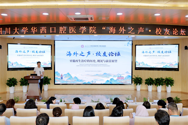2025 年 6 月 17 日上午,我院“海外之声·校友论坛”第一期活动在学术报告厅顺利举行。本期活动特别邀请到我院杰出校友何佳凝博士作为主讲嘉宾进行学术报告。四川大学副校长叶玲、我院副院长袁泉及学院师生代表参加论坛, “一带一路” 微创数字化牙体牙髓诊疗技术国际培训班的海外学员也参与其中,现场学术交流氛围浓厚。