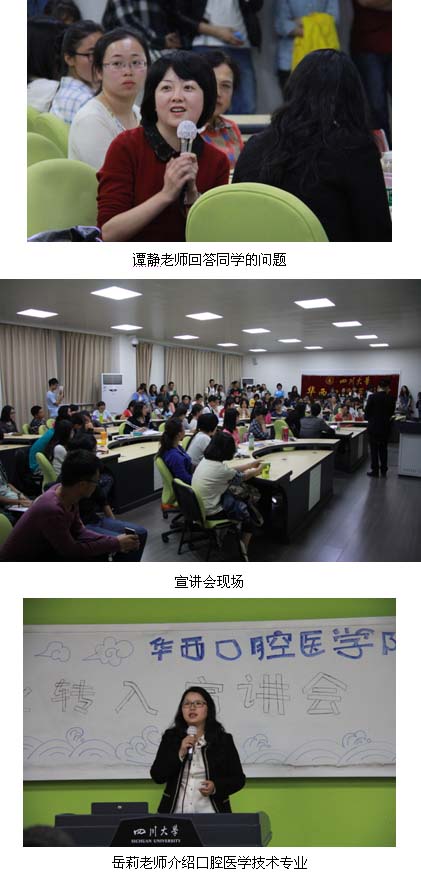2015年4月15日晚19:00,由我院分团委学生会主办的四川大学华西口腔医学院专业转入宣讲会于四川大学江安校区综合教学楼B座405室成功举办。到场嘉宾有我院党委副书记谭静老师、口腔医学技术教研室主任岳莉老师、学生分团委书记张金军老师、教务部刘孝宇老师、2014级教导员成丽老师及主持人2013级辅导员晋佑顺老师,来自四川大学各学院的同学参加了此次宣讲会,现场座无虚席。
