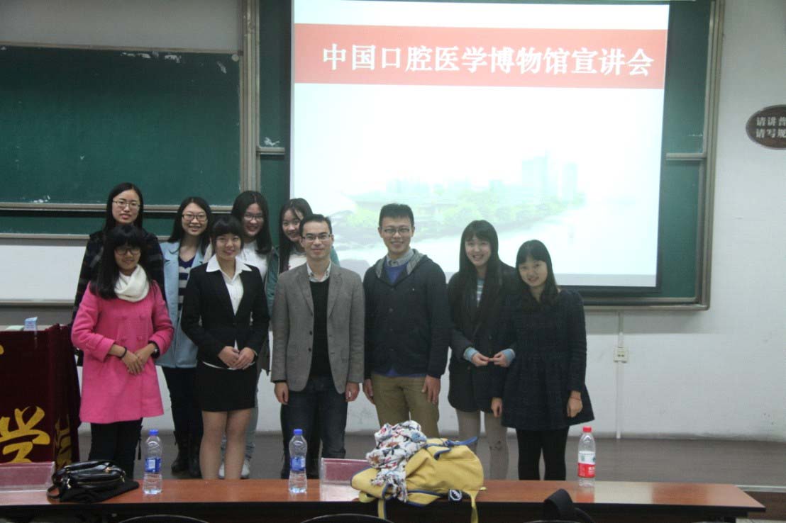 中国口腔医学博物馆讲解队由优秀的口腔医学生组成,他们分梯队、分语种地担任讲解员的任务,以饱满的姿态接待来自国内外的专家,献上口腔医学发展史的视听盛宴。2014年11月28日晚19:00在四川大学江安校区第一教学楼B座B103,由我院分团委礼仪部、历史与人文协会、语言艺术协会主办的宣讲会顺利进行,院分团委书记、中国口腔医学博物馆讲解队负责人张金军老师,2011级讲解员李谦顺、谢冰洁、李沛霖、陆文昕、孙闻天等组成的强大嘉宾阵容让人眼前一亮。