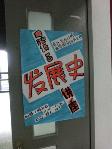 2013年12月20日10:10,由我院创业就业部主办并承办的“口腔设备发展史”的讲座在江安校区综合楼C座203室顺利举行。本次讲座由我院的万呼春教授作为演讲嘉宾。2013级的全体同学参与其中。