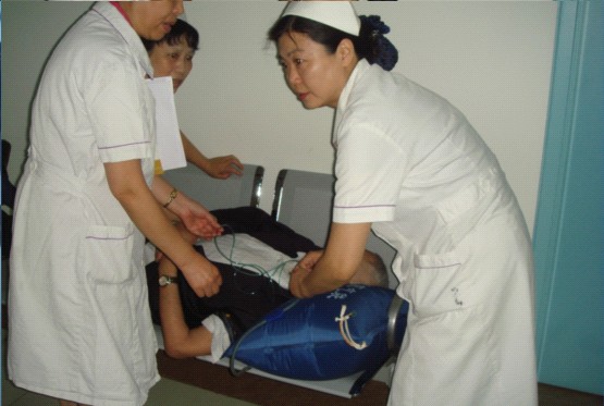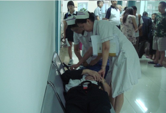 2011年6月17日早晨8点10分左右,固定修复科护士长鲁喆偶然发现一个老年男病人斜靠在检验科候诊长椅上,其家人在一旁焦急地呼喊,而病人没有任何反应。鲁喆急忙走近,发现病人双眼紧闭,面色苍白,大汗淋漓,呼吸微弱,大小便失禁。再摸脉搏,发现脉搏细弱,情况非常危急。她立刻把病人平放在椅子上,解开病人衣领,裤带,同时按照急救工作流程开始实施呼叫固定修复科护士推出抢救车、氧气筒,通知急诊科麻醉科相关科室急救人员,通知检验科采血等应急措施。