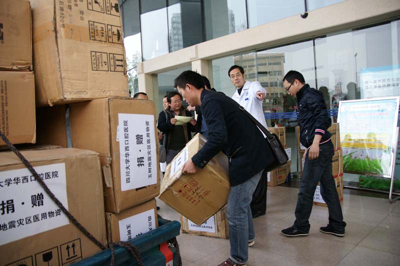 青海玉树县7.1级地震发生后,我院成立了以周学东院长任组长的抗震救灾领导小组,组成了一支后备医疗队随时待命 。口腔创伤整形病房约30张床位等待接纳伤员,以支部为单位组织了服务志愿者队协助附一院伤员治疗。同时,我院筹集了13万元抗生素和口腔急救用品,101万元口腔医疗设备,于4月15日下午,通过四川大学有关部门捐赠青海省卫生厅用于地震救灾。