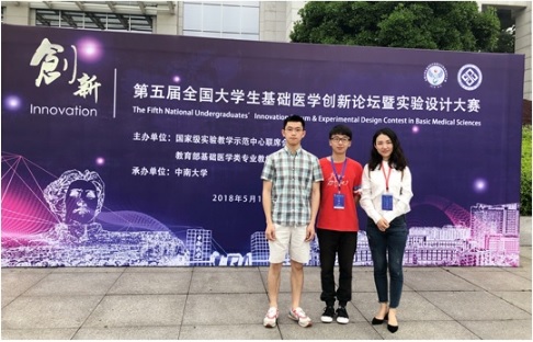 2018年5月11-14日,由国家级实验教学示范中心联系会、教育部基础医学类专业教学指导委员会联合主办的第五届全国大学生基础医学创新论坛暨设计大赛在星城长沙举行。来自北京大学、上海交通大学、复旦大学等全国108所大学近500名学生参加了比赛。我院2013级本科生文俊儒、2015级方仲瀚等同学代表四川大学参赛。经过激烈的角逐,由我院廖金凤老师指导,文俊儒同学主持的国家级大学生创新创业项目《BEPI-GO/CSMA自愈合水凝胶的制备和性能研究》凭借其创新性、缜密的实验设计和出色的现场汇报获得全场评委一致好评,勇夺全国一等奖。