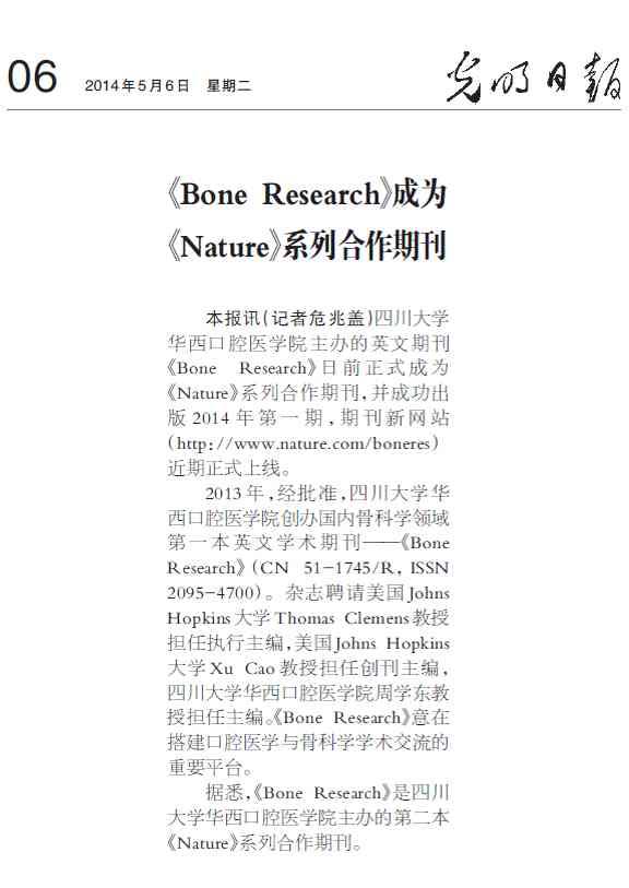 据悉,《Bone Research》是四川大学华西口腔医学院主办的第二本《Nature》系列合作期刊。
