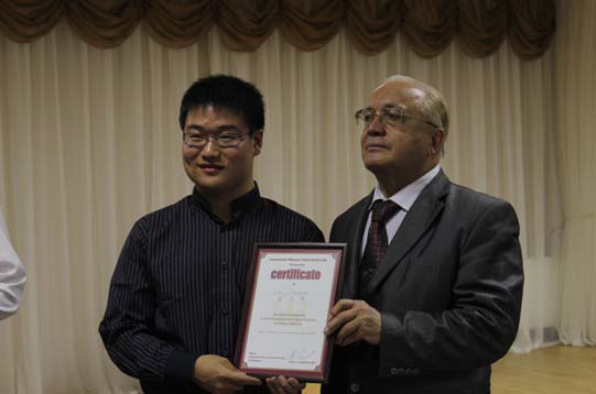 莫斯科大学校长萨多夫尼奇给吴天木同学颁发证书